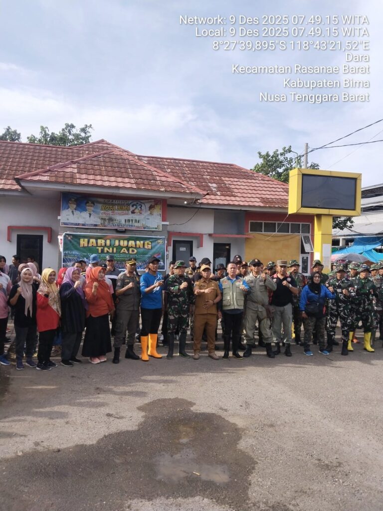 Kota Bima, Bima Times — Puluhan personel TNI bersama lintas instansi melaksanakan kegiatan gotong royong di Pasar Amahami, Kota Bima,